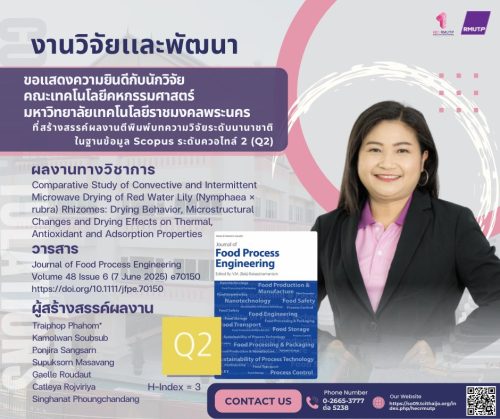 ขอแสดงความยินดีกับนักวิจัยคณะเทคโนโลยีคหกรรมศาสตร์ มหาวิทยาลัยเทคโนโลยีราชมงคลพระนคร ที่สร้างสรรค์ผลงานตีพิมพ์บทความวิจัย ระดับนานาชาติในฐานข้อมูล Scopus ระดับควอไทล์ 2 (Q2)